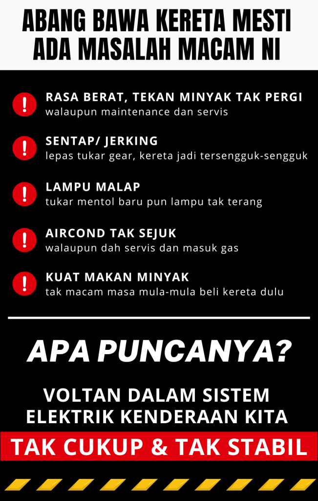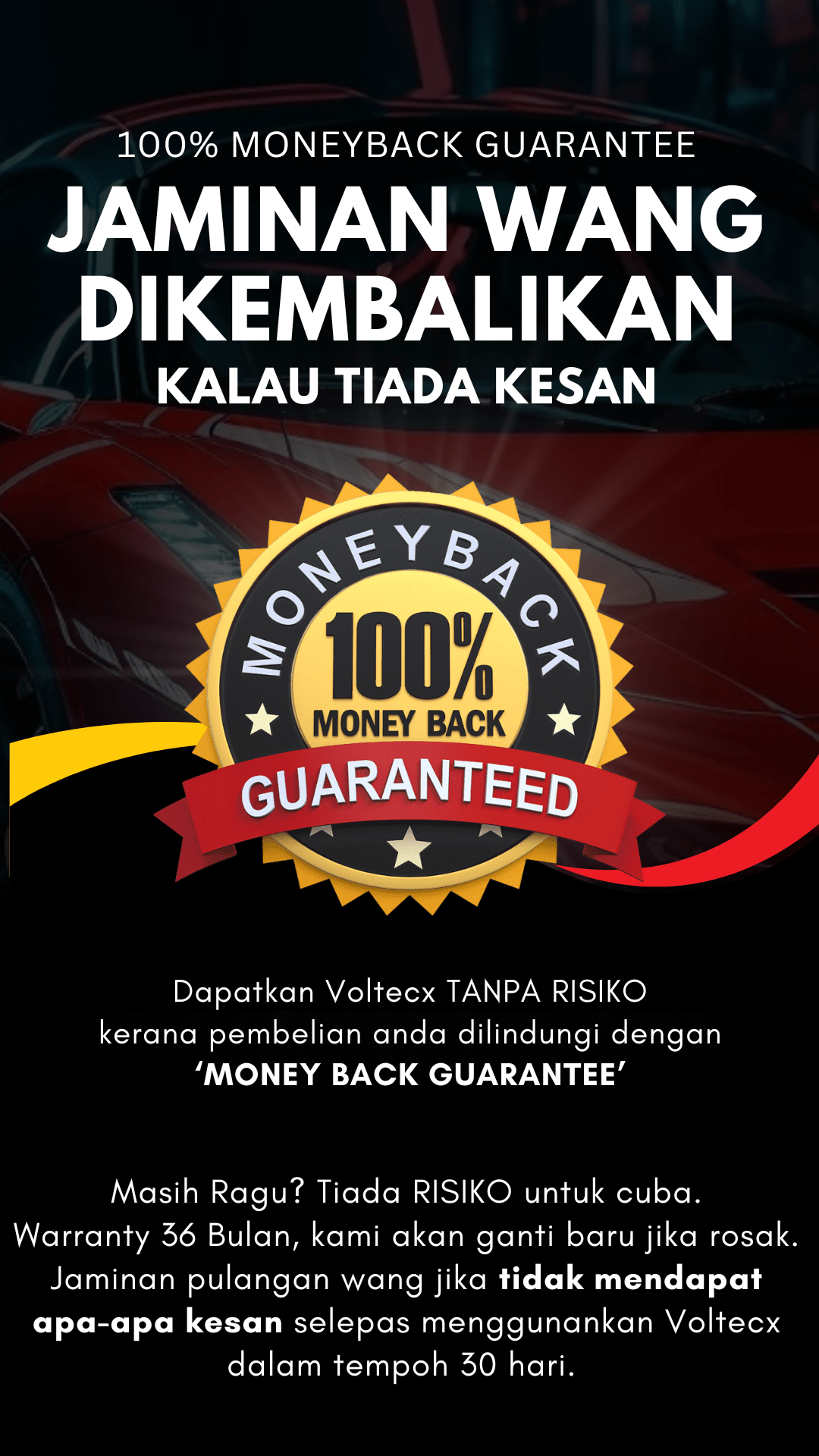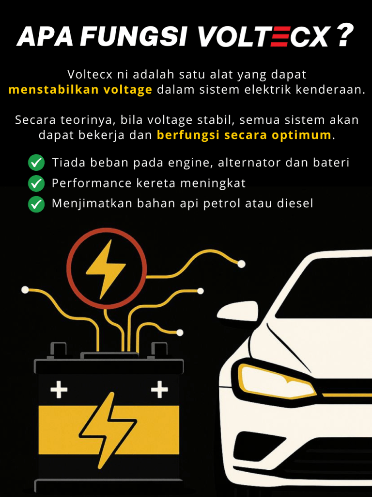 Voltecx tidak memberi buruk kesan kepada enjin dan sistem kenderaan. Voltecx membantu menstabilkan voltan dan mengembalikan prestasi kenderaan.