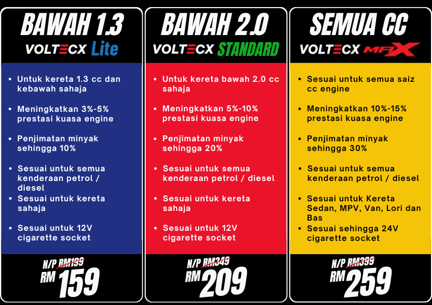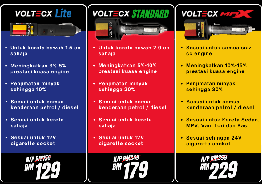 Kereta saya sesuai yang mana? Voltecx Lite, Voltecx Standard atau Voltecx Max?